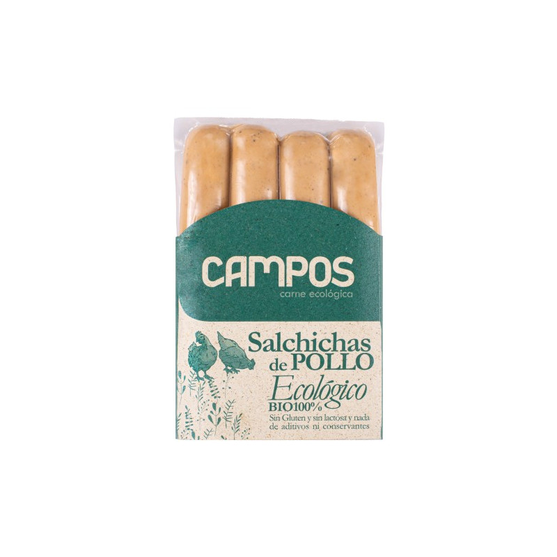Todos los ingredientes son 100% ecológicos: Carne de pollo CAT A 87%, agua, almidón de tapioca/mandioca, sal y mezcla de especias.