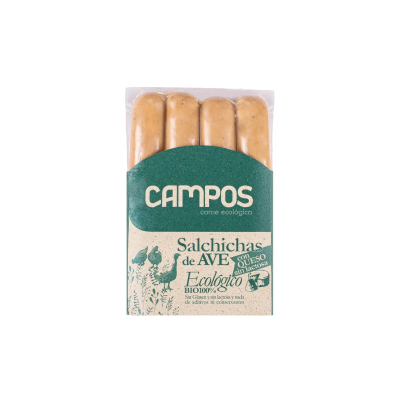 Todos los ingredientes son 100% ecológicos: Carne de pavo 40%, carne de pollo 40%, queso sin lactosa 11%, agua, almidón de tapioca, sal, mezcla de especias y MOSTAZA.