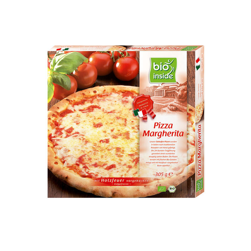 Ingredientes: base: harina de trigo*, agua, sal marina, aceite de girasol*, levadura*. Cobertura: queso mozzarella* 22,7% (leche), tomate tamizado* 18%, aceite de girasol*, cebolla*, ajo*, albahaca*, orégano*, pimienta*. Contiene gluten y leche. Puede contener soja.