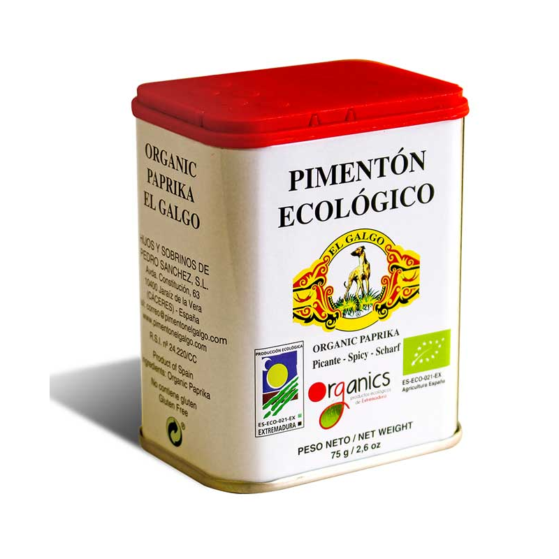 El pimentón ecológico El Galgo posee un sabor muy especial, muy original (no es ahumado) y de grandísima calidad. En este caso evidentemente se trata de un pimentón procedente de pimenteros tratados sin herbicidas, pesticidas y cultivados de forma totalmente ecológica, por supuesto poseen el sello de garantía de producto ecológico extremeño. Las latas de 75g de pimentón ecológico poseen el formato ideal para el consumo personal y familiar.