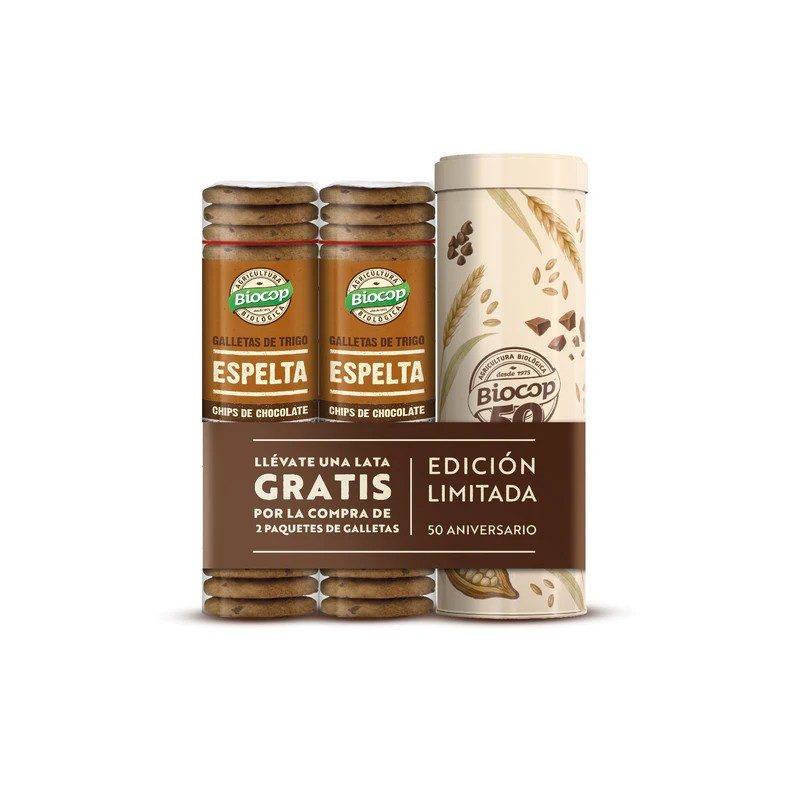 Celebra nuestro 50 aniversario con este pack especial: llévate una lata gratis por la compra de 2 paquetes de galletas. Edición limitada 50 aniversario. Cada pack contiene dos paquetes de galletas más una lata 50 aniversario Biocop.