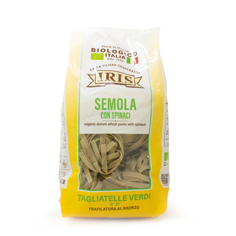 La pasta en formato tagliatelle de trigo con espinacas duro ecológica IRIS se produce con una mezcla de granos cuidadosamente seleccionados por ellos de su propia cosecha, para garantizar un producto con un alto valor nutricional y con una óptima resistencia a la cocción. Toda la elaboración responde plenamente al método tradicional, con dibujo en bronce, para obtener una pasta agradablemente más rugosa y porosa, ideal para absorber y realzar las salsas.