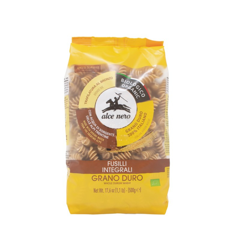 Fusilli de trigo integral elaborado con trigo italiano ecológico procedente del altiplano de Murge, entre Puglia y Basilicata, en el sur de Italia. Rico en fibra y con un mayor contenido en proteína. Ideal para combinar con cualquier tipo de salsa o para añadir en ensaladas.